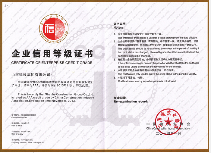 全國(guó)建筑業(yè)AAA級(jí)信用企業(yè)由中國(guó)建筑業(yè)協(xié)會(huì)頒發(fā),是建筑行業(yè)信用最高獎(jiǎng)項(xiàng)。此次評(píng)價(jià)嚴(yán)格按照《建筑業(yè)企業(yè)信用評(píng)價(jià)試行辦法》規(guī)定的程序進(jìn)行。經(jīng)企業(yè)自愿申報(bào)、各地區(qū)和有關(guān)行業(yè)、建筑業(yè)協(xié)會(huì)推薦、在建設(shè)系統(tǒng)相關(guān)網(wǎng)站上排查、專家評(píng)價(jià)組初評(píng)、全國(guó)建筑業(yè)企業(yè)信用評(píng)價(jià)工作指導(dǎo)委員會(huì)審定和網(wǎng)上公示。通過(guò)層層篩選,最終,包括山河建設(shè)集團(tuán)有限公司在內(nèi)的93家企業(yè)評(píng)定為2013年度全國(guó)建筑業(yè)AAA級(jí)信用企業(yè)。