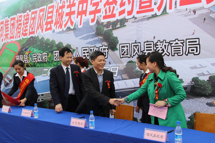 4月15日上午,山河集團(tuán)捐建團(tuán)風(fēng)縣城關(guān)中學(xué)簽約暨奠基開(kāi)工儀式舉行,團(tuán)風(fēng)縣副縣長(zhǎng)黃菊花代表縣人民政府與山河集團(tuán)董事長(zhǎng)程理財(cái)簽訂了捐建協(xié)議書(shū)。