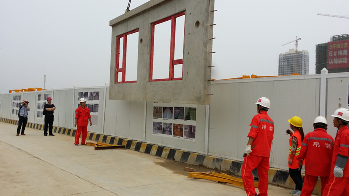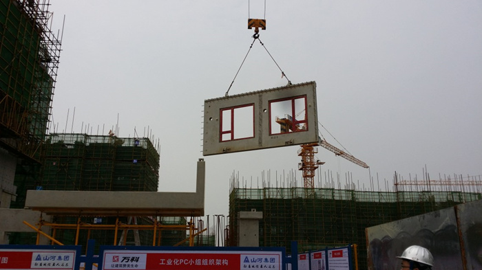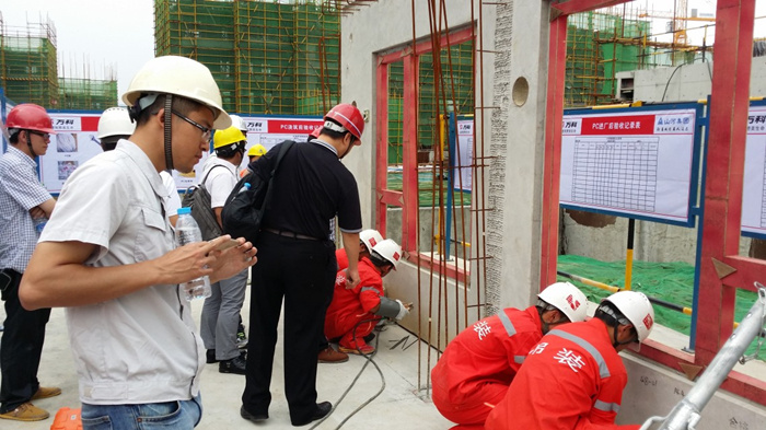 通過項(xiàng)目部數(shù)月的籌劃,南昌萬(wàn)科海上傳奇項(xiàng)目PC實(shí)驗(yàn)樓于2014年5月26日正式開始吊裝。吊裝前我項(xiàng)目部專業(yè)吊裝人員分別將吊具、調(diào)節(jié)腳碼、斜支撐、鋼絲繩、攬風(fēng)繩、鋼扁擔(dān)等安裝輔助工具準(zhǔn)備就位,依據(jù)技術(shù)交底內(nèi)容、項(xiàng)目部的統(tǒng)籌安排及指揮,按照制定的PC吊裝時(shí)間行程,將實(shí)驗(yàn)樓的PC構(gòu)件一次順利吊裝成功并調(diào)試合格。