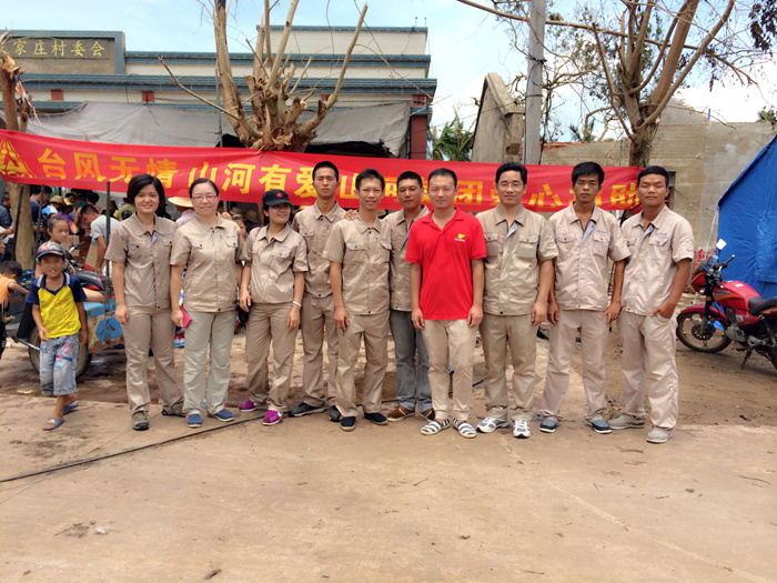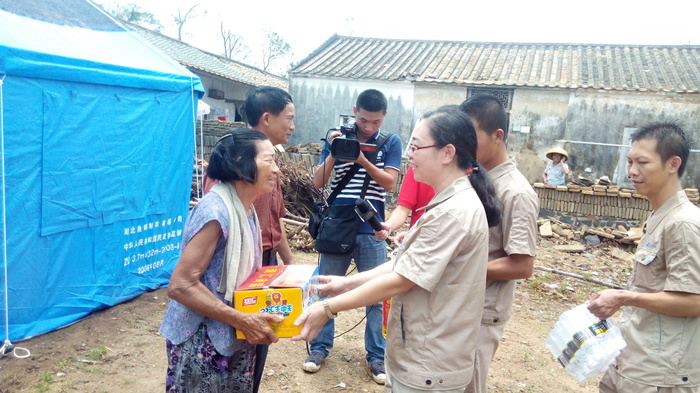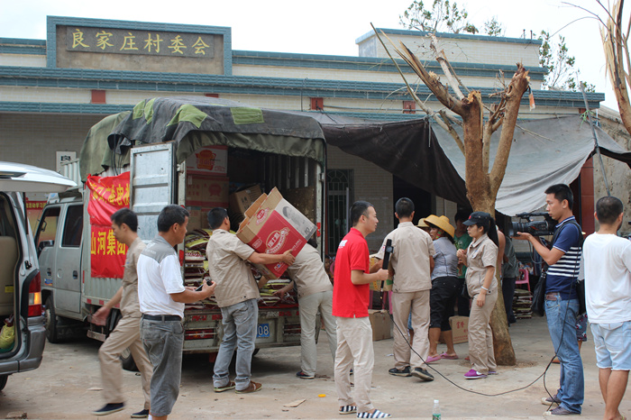 與此同時,海南各地都是眾志成城的救災場面,一方有難,八方支援。山河集團在開展自救的同時,心系災民,當?shù)弥貫膮^(qū)文昌部分村鎮(zhèn),由于交通偏僻,信息不暢,得不到及時救助,災民的生活非常的艱難時,山河人心急如焚。山河集團已進駐海南6年,扎根海南、情系海南。在災難面前,山河人勇于擔當,自發(fā)的組織捐款10萬余元,采購了幾噸急需生活物資,如米、油、水、食品、藥品等。7月26日,在??跓釒Р笥浾叩膸ьI(lǐng)下,公司組織員工來到了一線災區(qū)文昌市錦山鎮(zhèn)良民村。 當我們來到該村時,村民已等待多時,看到我們的到來非常的激動。當時下著大雨,村民們顧不上遮蓋自家的屋頂、收拾東西,都趕來搬運救災物資,雨水、汗水、淚水流淌在臉上,感激之情流淌在心間。在村長的帶領(lǐng)下,我們見到了村里的低保戶年邁的阿婆,她老無所倚,幾年前她兒子去逝了,幾天前兒媳重病也去逝了,現(xiàn)只剩下小孫兒相依為命,臺風又讓這個本來很不幸的家庭受到重創(chuàng),她們失去了僅有的一間住所,現(xiàn)寄住在只有幾個平方的一個臨時的帳篷里,當我們把米、油等物資送到阿婆的手中時,她熱淚盈眶,緊握我們的雙手,不停的道謝,看到老人的悲痛淚水,我們不禁心酸,淚水打濕了眼眶。我們鼓勵她建立對生活的信心,同時也希望社會給予她更多的關(guān)愛,讓她的晚年生活無憂。