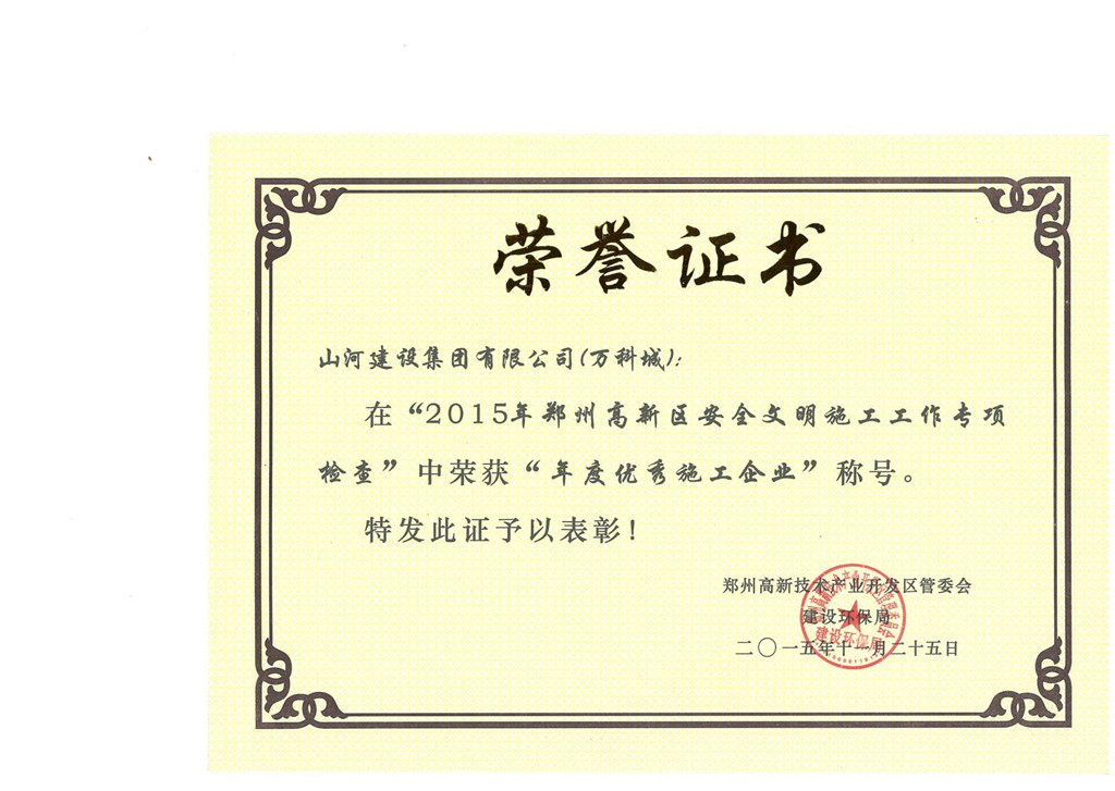 11月25日,在鄭州高新區(qū)安全文明施工專項檢查中,山河建設(shè)集團有限公司榮獲由鄭州高新區(qū)管理會建設(shè)環(huán)保局授予的“年度優(yōu)秀施工企業(yè)”榮譽稱號。