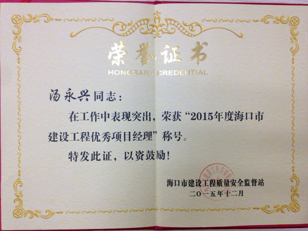 據(jù)悉,??谑袃?yōu)秀項目經(jīng)理的評選條件非常嚴(yán)格,要求候選人必須是取得一級建造師資質(zhì)的在崗項目經(jīng)理,在海口市“雙創(chuàng)”工作及工程項目管理中取得優(yōu)異成績。湯永興同志自擔(dān)任項目經(jīng)理以來,嚴(yán)格執(zhí)行質(zhì)量管理和施工管理,編制施工組織設(shè)計,合理配置資源,優(yōu)化方案,正確處理質(zhì)量、安全、文明施工、進(jìn)度和成本的關(guān)系,不斷完善項目工地管理體制。同時,高度重視人才培養(yǎng),始終堅持山河集團(tuán)“勤懇誠信 惠人達(dá)己”的核心價值觀,通過建立健全人才發(fā)展通道和激勵約束機制,讓人才引得進(jìn)、留得住、用得好,真正做到核心人才有為有位,優(yōu)秀人才脫穎而出,為項目穩(wěn)定發(fā)展做出了突出的貢獻(xiàn)。