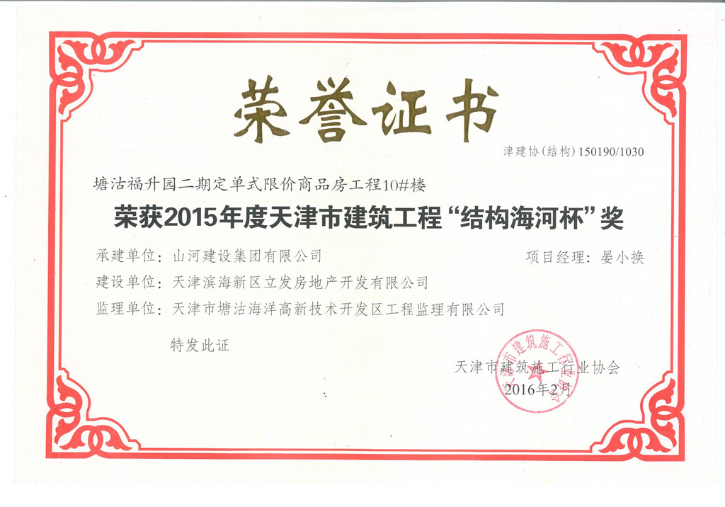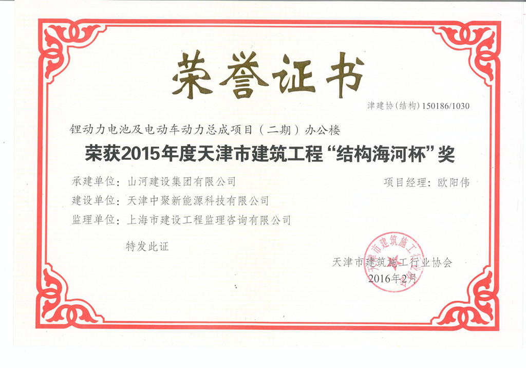 1月29日,天津市建筑業(yè)協(xié)會正式公布了2015年度“天津市結(jié)構(gòu)海河杯獎”評選結(jié)果。由山河集團天津公司承建的鋰動力電池及電動車動力總成項目(二期)1#~4#車間及辦公樓工程和塘沽福升園二期定單式限價商品房工程7#~10#樓同時獲此殊榮。這是山河集團進入天津市場以來,首次獲得天津市建設(shè)工程質(zhì)量方面的最高榮譽獎。