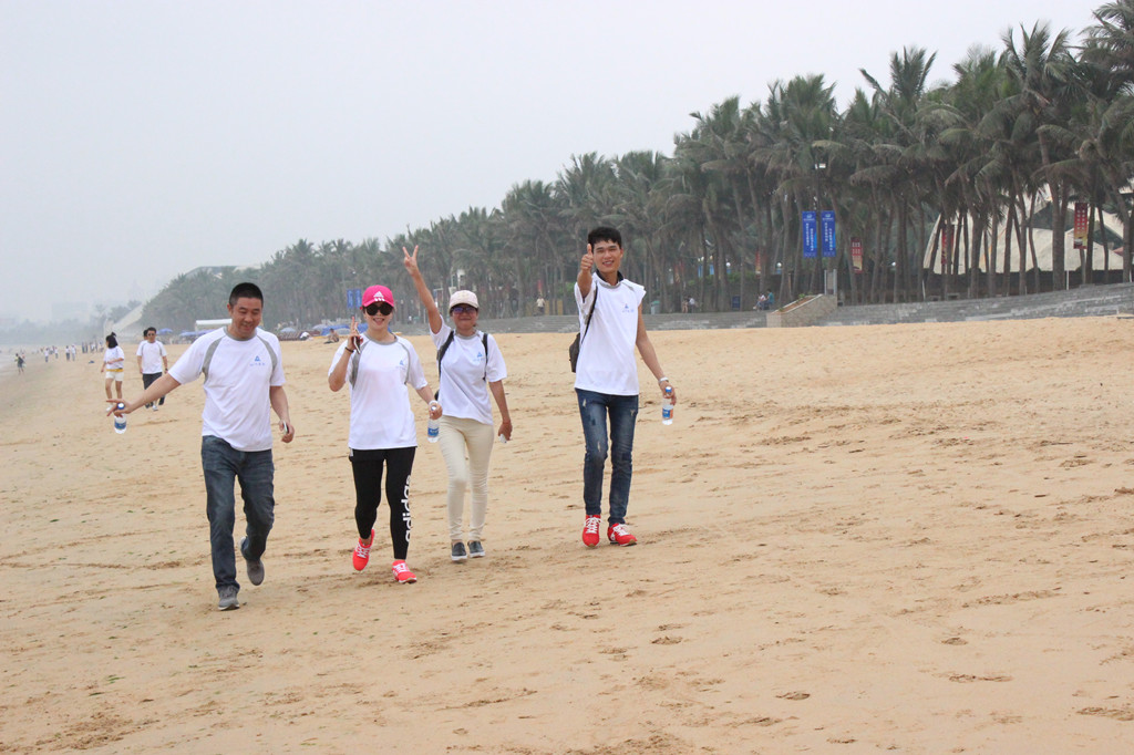 活動(dòng)當(dāng)天,碧海藍(lán)天微風(fēng)輕拂,參加徒步的員工一早便來(lái)到集合地點(diǎn),海南公司活動(dòng)線路設(shè)置在??谖餍愫┲临F族游艇會(huì),全程路段以沙灘為主。海南公司、??诤阏龑?shí)業(yè)公司及各項(xiàng)目部代表共計(jì)50人參加了徒步行的活動(dòng),比賽共分為15組,每個(gè)小組三人,其中有一名隊(duì)員必須是異性。為體現(xiàn)山河大家庭的氛圍,公司人員全部與項(xiàng)目部人員混編組隊(duì)。