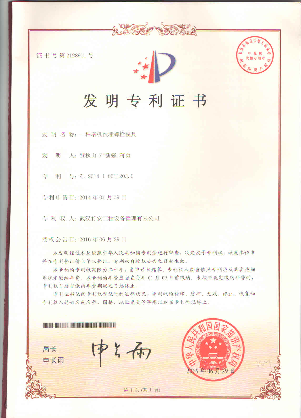 近日,武漢竹安設(shè)備管理有限公司首次研發(fā)的一項發(fā)明專利“一種塔機預(yù)埋螺栓模具”獲國家知識產(chǎn)權(quán)局授權(quán),專利號:ZL200410011203.0。