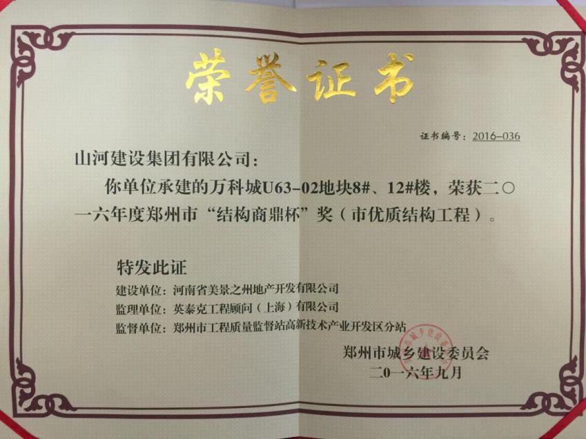 近日,從鄭州市城鄉(xiāng)建設(shè)委員會再次傳來喜訊,山河集團河南公司承建的萬科城U63-02地塊的8#、12#樓榮獲2016年度鄭州市“結(jié)構(gòu)商鼎杯”(市優(yōu)質(zhì)結(jié)構(gòu)工程)獎。這是該項目繼2016年3月獲得“鄭州市建筑施工安全生產(chǎn)標(biāo)準(zhǔn)化示范項目”后,再獲殊榮。