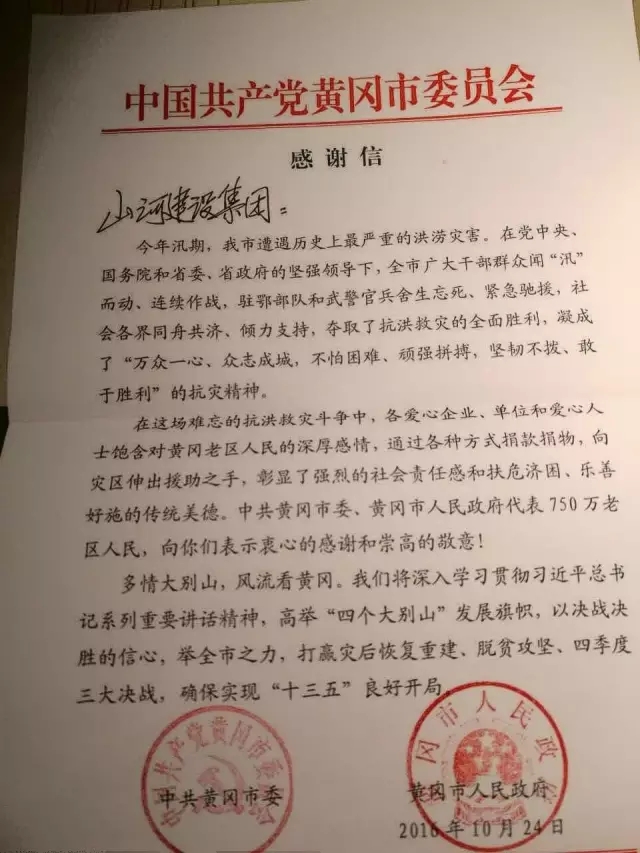 山河集團(tuán)在這場難忘的抗洪救災(zāi)斗爭中,通過各種方式捐款捐物,伸出援助之手,其中飽含了對黃岡老區(qū)人民的深厚感情,更彰顯了強(qiáng)烈的社會責(zé)任感與作為“中國500強(qiáng)”的企業(yè)擔(dān)當(dāng)。