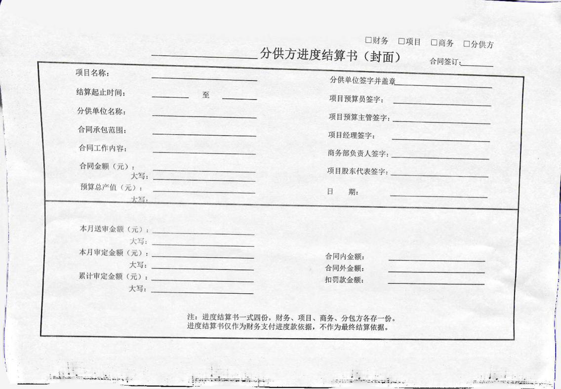 2、其次,項(xiàng)目商務(wù)部、材料部門(mén)每月20-25日根據(jù)本月現(xiàn)場(chǎng)完工進(jìn)度及材料收料清單,對(duì)已簽訂合同的各分供方辦理進(jìn)度結(jié)算,完成多少結(jié)算多少,項(xiàng)目經(jīng)理在結(jié)算書(shū)封面簽字確認(rèn)后,交財(cái)務(wù)及時(shí)入賬。