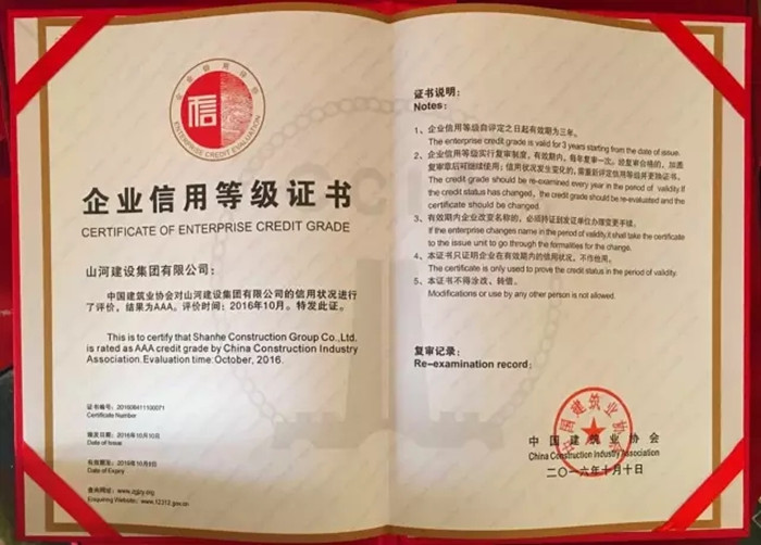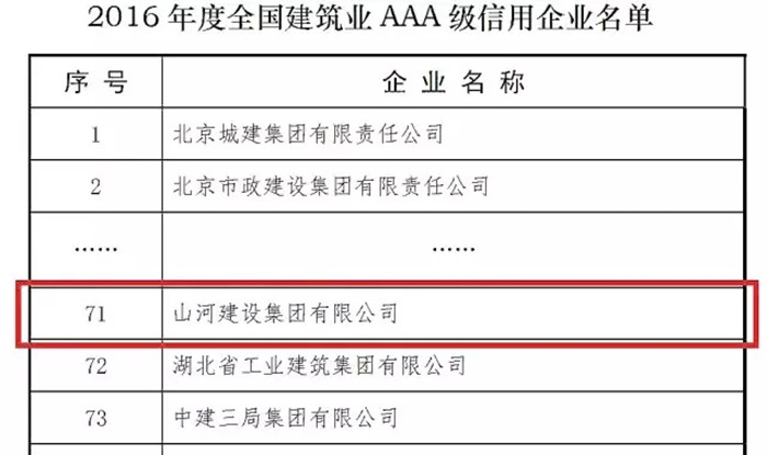 再傳喜訊 山河集團榮獲“全國建筑業(yè)AAA級信用企業(yè)”稱號