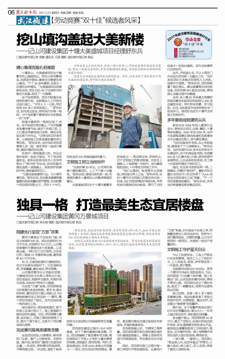 今天(3月23日)出版的楚天都市報,在顯著位置(06版),以整個版面的篇幅重點展示了山河集團在武漢建筑及勘察設計行業(yè)勞動競賽“雙十佳”中候選者的風采,候選者包括“十佳建設者”和“十佳建設項目”,標題分別為《挖山填溝蓋起大美新樓――記山河建設集團十堰大美盛城項目經(jīng)理舒東兵》、《獨具一格打造最美生態(tài)宜居樓盤――記山河建設集團黃岡萬景城項目》。