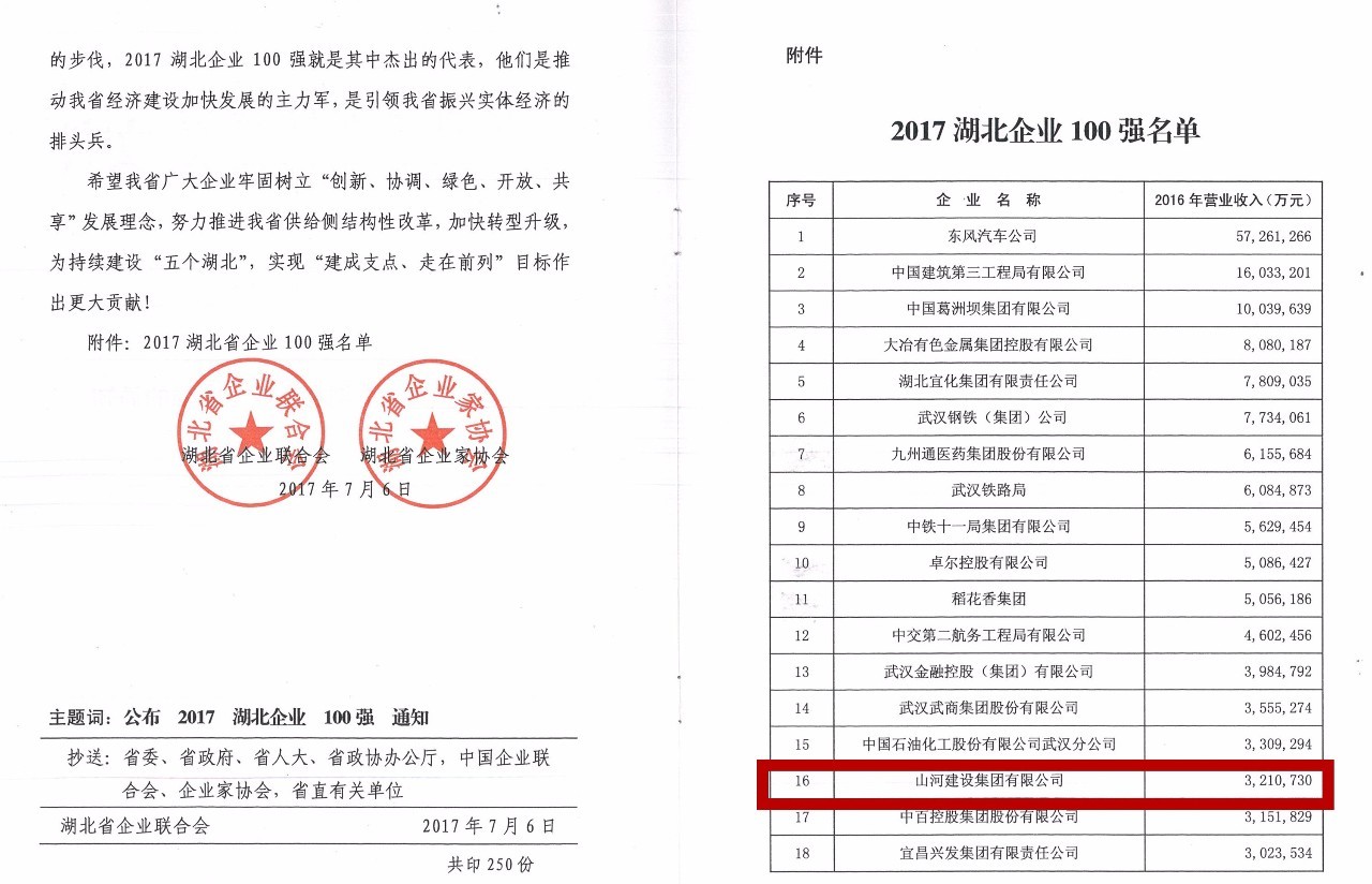 “荊楚風(fēng)云匯,百?gòu)?qiáng)戰(zhàn)鼓擂”。7月6日,湖北省企業(yè)聯(lián)合會(huì)、湖北省企業(yè)家協(xié)會(huì)發(fā)布“2017湖北企業(yè)100強(qiáng)”榜單。山河集團(tuán)2016年度以營(yíng)業(yè)收入321.073億元的實(shí)績(jī)名列2017湖北企業(yè)100強(qiáng)第16位,較去年第17位又上升了1位。
