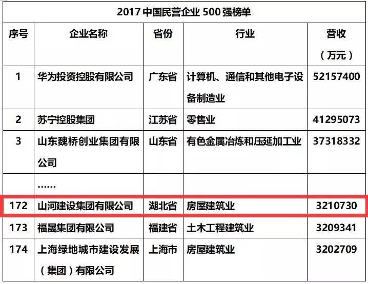8月24日上午,在山東濟(jì)南舉行的“2017中國民營企業(yè)500強(qiáng)發(fā)布暨民營經(jīng)濟(jì)發(fā)展峰會”上,全國工商聯(lián)發(fā)布了“2017中國民營企業(yè)500強(qiáng)榜單”,山河集團(tuán)以2016年營收總額321億元,名列“2017中國民營企業(yè)500強(qiáng)”第172位。同時,在“2016年民營企業(yè)建筑業(yè)前20家”中,位列第10位。