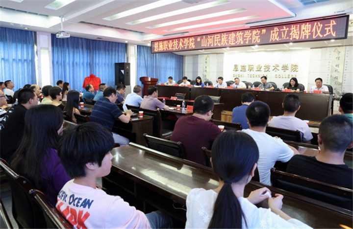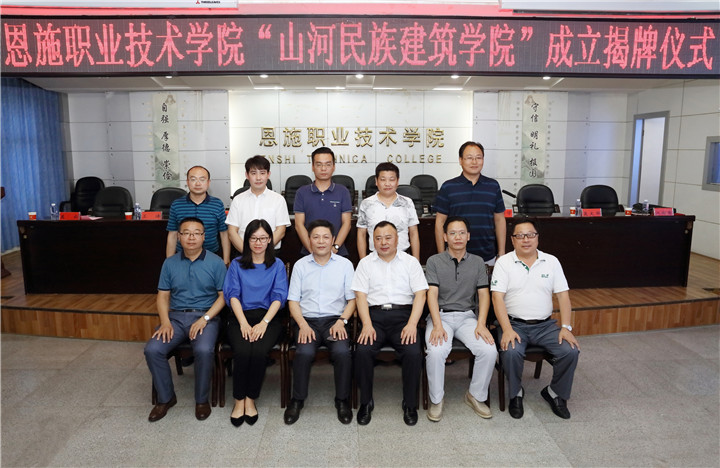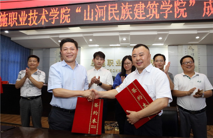 會上,恩施職業(yè)技術(shù)學(xué)院院長張捷致辭;山河集團人力資源總監(jiān)李穎宣讀校企合作辦學(xué)協(xié)議書;集團董事長程理財與恩施職業(yè)技術(shù)學(xué)院院長張捷進行聯(lián)合辦學(xué)現(xiàn)場簽約,并共同為“山河民族建筑學(xué)院”揭牌。