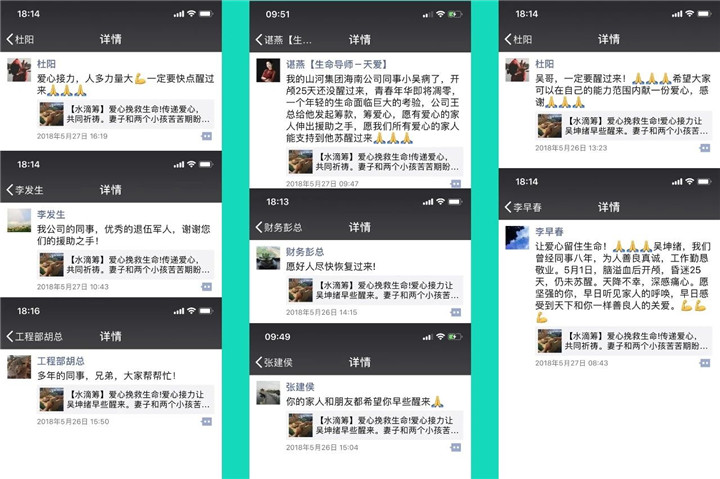 他的遭遇牽動(dòng)著海南公司原同事們的心。海南公司員工紛紛自發(fā)為他募捐,并爭(zhēng)相用微信轉(zhuǎn)發(fā)他的病情,集團(tuán)員工朋友圈一度被自發(fā)援助吳坤緒的愛(ài)心舉動(dòng)刷屏。
