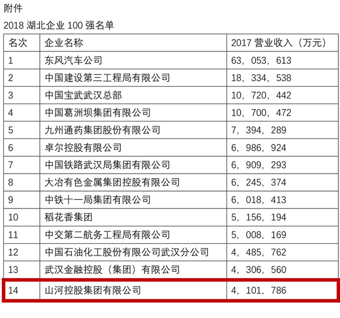 “荊楚百強(qiáng),再立潮頭。”7月20日,山河控股集團(tuán)以2017年度營業(yè)收入410.1786億元的實績再次上榜“2018湖北企業(yè)100強(qiáng)”,名列第14位,較去年第16位再次上升2個位次。當(dāng)天,湖北省企業(yè)聯(lián)合會、湖北省企業(yè)家協(xié)會公布了這個令山河人振奮的消息。