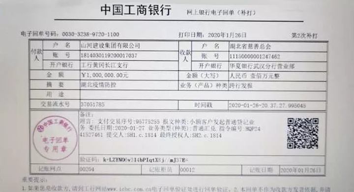 1月26日,山河集團(tuán)通過湖北省慈善總會(huì)捐贈(zèng)100萬元人民幣,全力支持黃岡地區(qū)的疫情防控工作。根據(jù)疫區(qū)前線的需求,用于采購防護(hù)服、口罩、消毒液等醫(yī)療防護(hù)用品,為醫(yī)務(wù)人員提供幫助和支持。