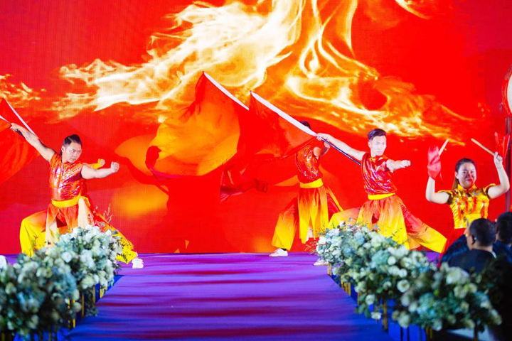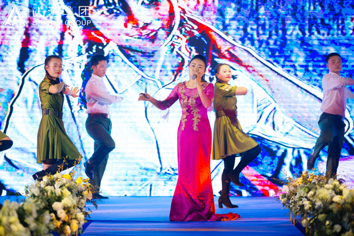 在鑼鼓喧天中,一面面紅旗接踵而至,宛如祖國(guó)山河建設(shè)崛地而起,開(kāi)場(chǎng)舞《旗開(kāi)得勝》拉開(kāi)了年會(huì)的序幕,預(yù)示著新的一年旗開(kāi)得勝,馬到成功。