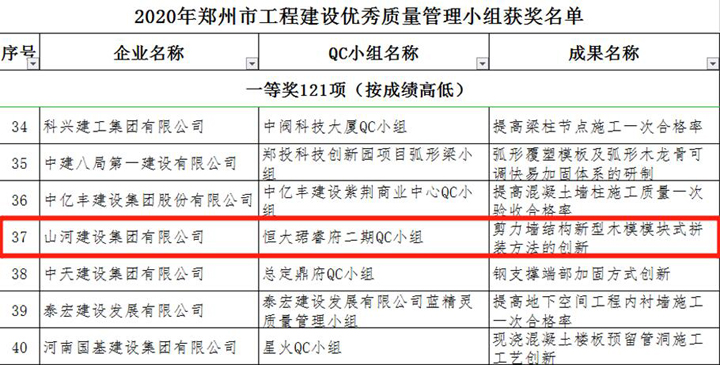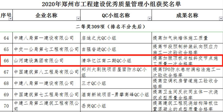 3月23日,鄭州市建筑業(yè)協(xié)會發(fā)布《關于表彰2020年鄭州市工程建設優(yōu)秀質(zhì)量管理小組活動成果的通知》,山河建設集團河南公司申報的三項成果榜上有名,恒大珺睿府二期QC小組獲得一等獎,清華憶江南二期QC小組、永豐樂城QC小組分別獲得二等獎。