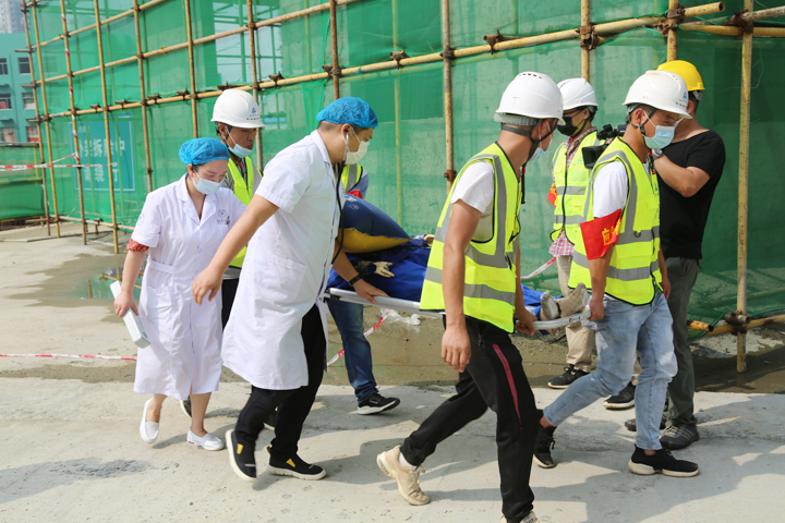 救護(hù)車閃爍著紅燈疾馳而來(lái),醫(yī)護(hù)人員帶著擔(dān)架、急救醫(yī)療設(shè)備一路小跑進(jìn)入事故現(xiàn)場(chǎng),對(duì)受傷“工人”進(jìn)行初步包扎處理后,將其抬上救護(hù)車并安排專人陪同送往醫(yī)院。