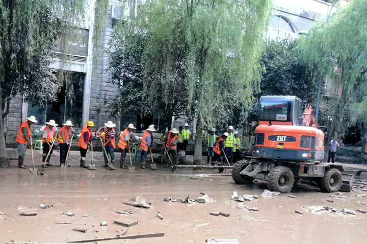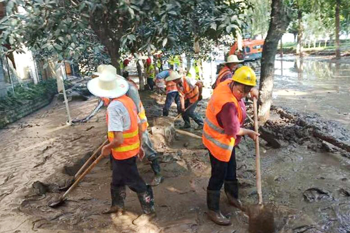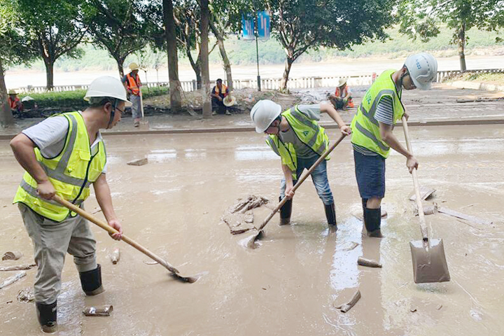 8月19日至20日,“長江2020年第5號洪水”“嘉陵江2020年第2號洪水”陸續(xù)通過重慶主城區(qū),巴南區(qū)魚洞江濱路、巴濱路、木洞、李家沱等低洼地區(qū)受災嚴重。山河建設集團西南公司碧桂園巴南工貿(mào)園項目部主動請纓,組織管理人員及工人成立了一支道路清淤志愿隊,積極投入到救災工作中。