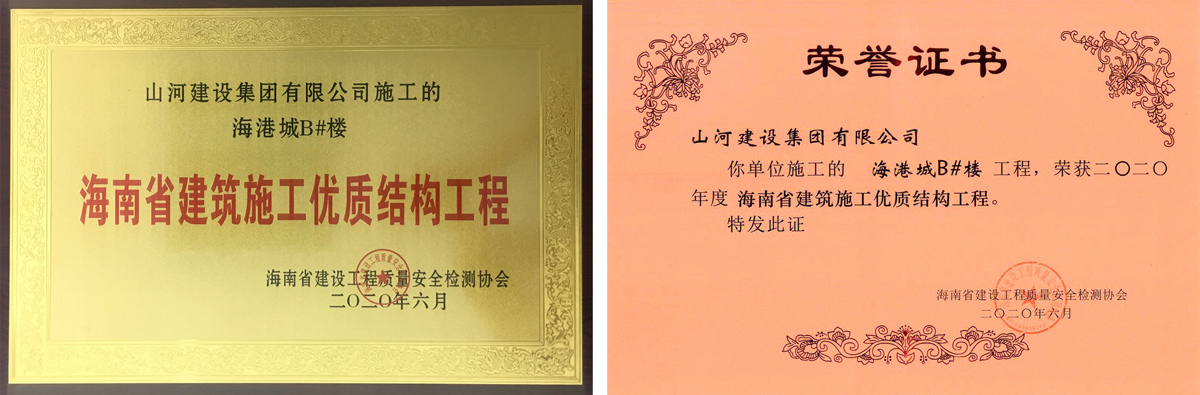 [海南公司]山河集團海南公司海港城項目B#樓榮獲“海南省建筑施工優(yōu)質(zhì)結(jié)構工程”