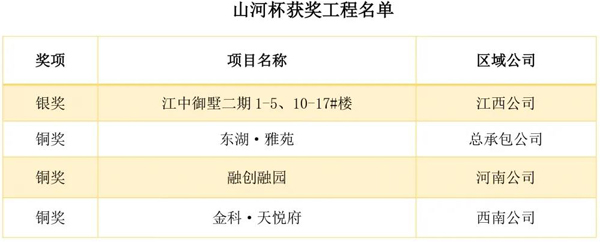 山河杯:“山河杯”是集團(tuán)工程質(zhì)量最高獎項(xiàng),要求申報項(xiàng)目達(dá)到一定規(guī)模,完成竣工驗(yàn)收備案,經(jīng)過一年使用沒有發(fā)現(xiàn)質(zhì)量缺陷和質(zhì)量隱患,獲得項(xiàng)目所在地優(yōu)質(zhì)結(jié)構(gòu)工程、優(yōu)質(zhì)建筑工程質(zhì)量獎項(xiàng)等。