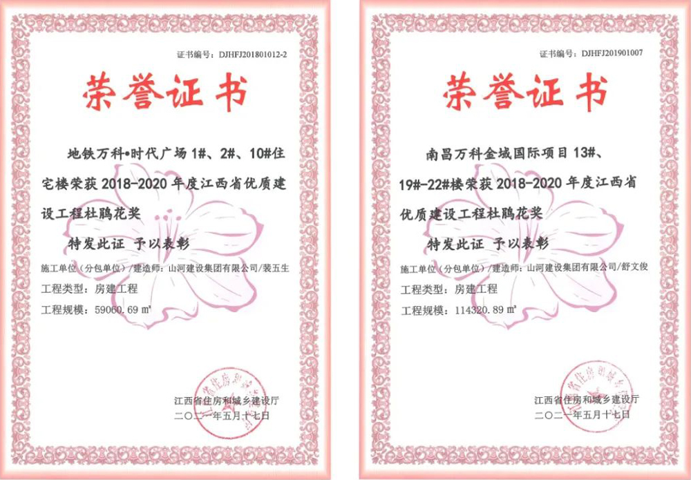 近日,江西省住房和城鄉(xiāng)建設(shè)廳發(fā)布《關(guān)于表彰2018-2020年度江西省優(yōu)質(zhì)建設(shè)工程獎獲獎工程的通報》,山河建設(shè)集團(tuán)江西公司承建的地鐵萬科·時代廣場、萬科金域國際項目雙雙獲得江西省優(yōu)質(zhì)建設(shè)工程杜鵑花獎。