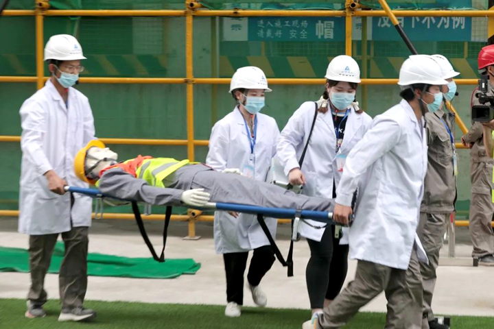 項(xiàng)目經(jīng)理發(fā)出指令,立即啟動(dòng)應(yīng)急救援預(yù)案,同時(shí)撥打120求助,并向上級(jí)單位報(bào)告。警戒隔離組、搶險(xiǎn)救援組、醫(yī)療救護(hù)組先后進(jìn)入事發(fā)區(qū)域,拉設(shè)警戒區(qū),檢查傷者情況并進(jìn)行初步包扎處理,撤離作業(yè)人員,將傷者抬上擔(dān)架送上救護(hù)車(chē),一系列行動(dòng)有力有序,“受傷工人”得到了及時(shí)救治。