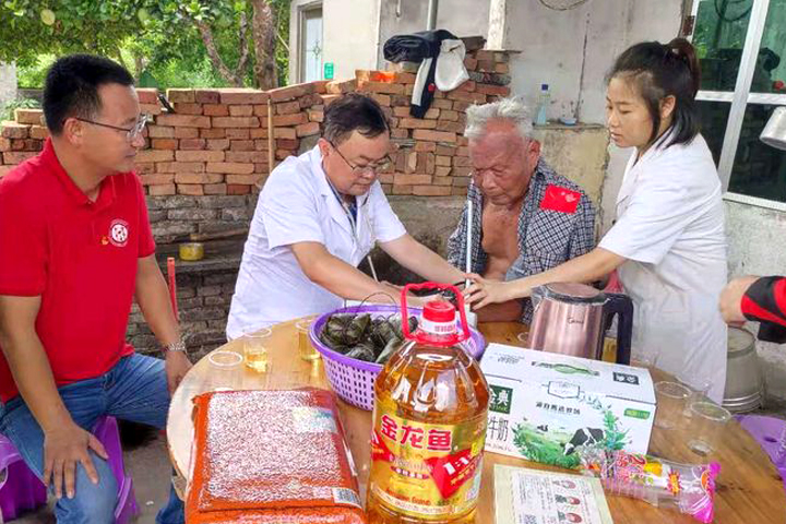 活動(dòng)中,海南省湖北商會(huì)儋州分會(huì)黨支部書記、山河建設(shè)集團(tuán)海南?;◢u項(xiàng)目部黨支部書記童學(xué)軍帶隊(duì)走訪了5名黨齡超過(guò)50年的老黨員、5名生活困難的黨員,為他們送去慰問金及米、油、牛奶、蘄艾眼貼等慰問品,還帶著醫(yī)生上門服務(wù),為他們進(jìn)行了健康體檢。走訪中,黨員、職工和老黨員親切交流,仔細(xì)詢問了他們的生活、身體狀況,叮囑他們要保重身體,安享晚年。