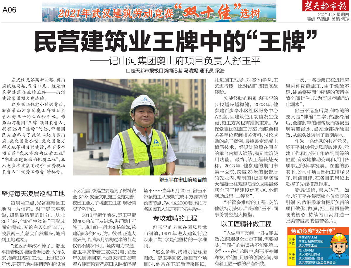 這座商品住宅小區(qū)的背后,凝聚著山河集團(tuán)奧山府項(xiàng)目負(fù)責(zé)人舒玉平的心血和汗水。作為山河集團(tuán)“王牌”項(xiàng)目負(fù)責(zé)人,擁有26年“建齡”的他,帶領(lǐng)團(tuán)隊(duì)先后參與了武漢二妃山奧山府、武穴國(guó)鼎公館、武穴國(guó)鼎萬(wàn)得天地等項(xiàng)目的建設(shè),手下多個(gè)項(xiàng)目獲“武漢市結(jié)構(gòu)優(yōu)質(zhì)工程”“湖北省建筑結(jié)構(gòu)優(yōu)質(zhì)工程”,本人也多次被集團(tuán)授予“優(yōu)秀現(xiàn)場(chǎng)負(fù)責(zé)人”“優(yōu)秀工作者”等稱(chēng)號(hào)。