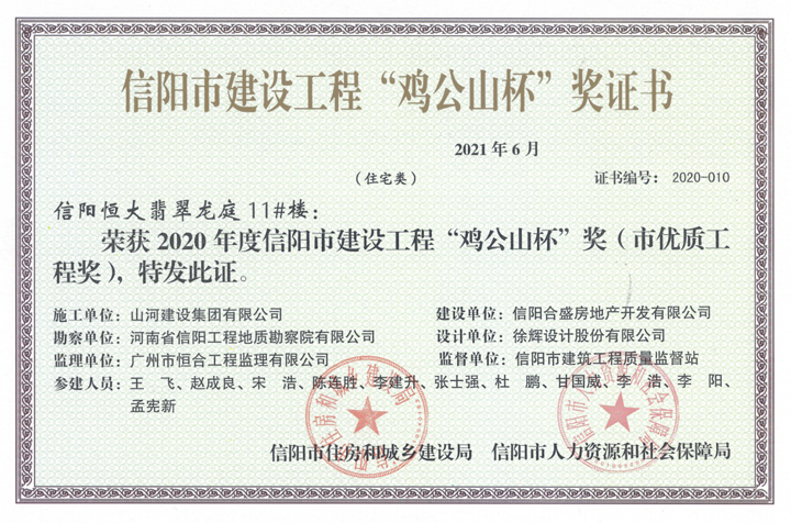 [河南公司]山河集團河南公司恒大翡翠龍庭項目榮獲信陽市“雞公山杯”獎