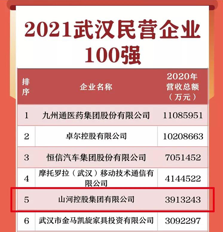 8月26日,“2021武漢民營企業(yè)100強(qiáng)”排序榜正式發(fā)布,山河集團(tuán)名列榜單第5位,穩(wěn)居第一方陣。