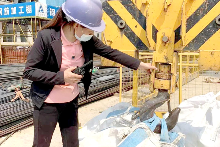 ▲居住項目(湖北交投產城華園二期)塔吊指揮員在吊裝前對起重設備吊具進行自檢