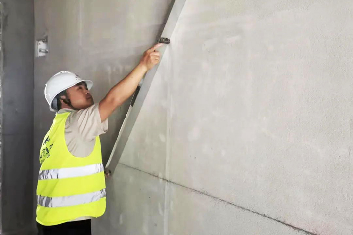 ▲遂川碧桂園項目抹灰班組工人進行石膏抹灰沖筋