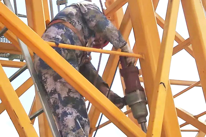 ▲定安牧嶼云天項目塔吊安拆工在做拆除塔吊前的準備工作