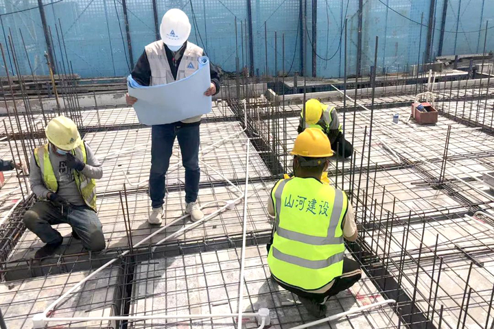▲中山農商銀行項目施工人員進行負3層地下室底板鋼筋綁扎