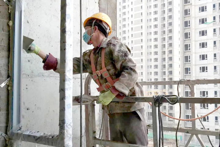▲西安龍發(fā)天泉灣項目工人在給窗框收口抹灰