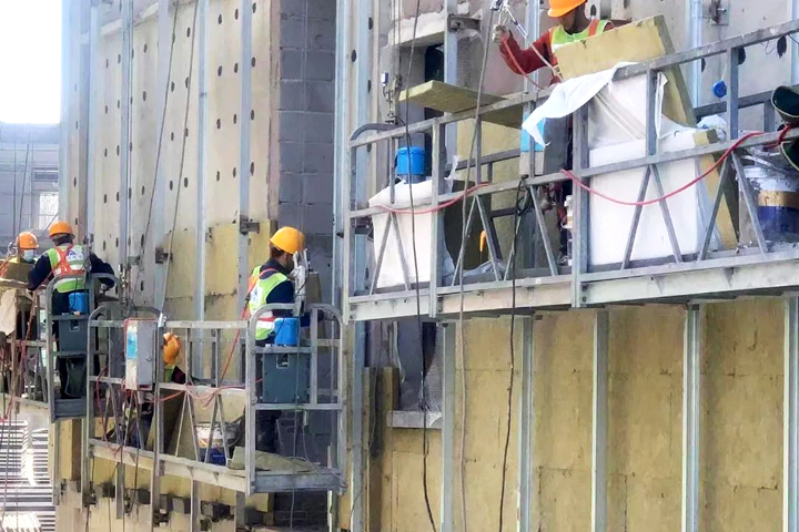 ▲天津華測儀器儀表制造項目工人在進行外墻施工