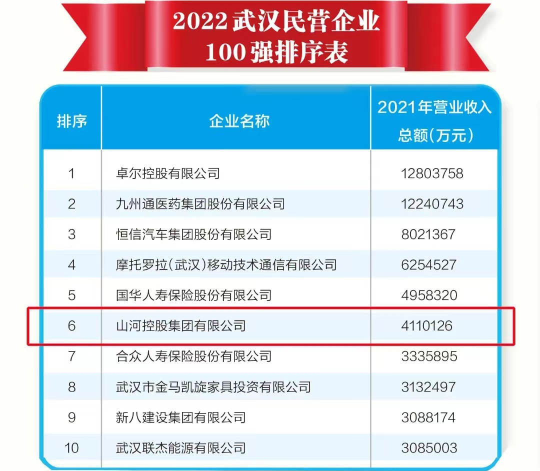 8月19日,2022武漢民營企業(yè)100強、民營制造業(yè)企業(yè)50強發(fā)布會暨金融服務(wù)民營企業(yè)高質(zhì)量發(fā)展大會在武漢會議中心召開。大會發(fā)布的“2022武漢民營企業(yè)100強”榜單上,山河集團名列第6位。