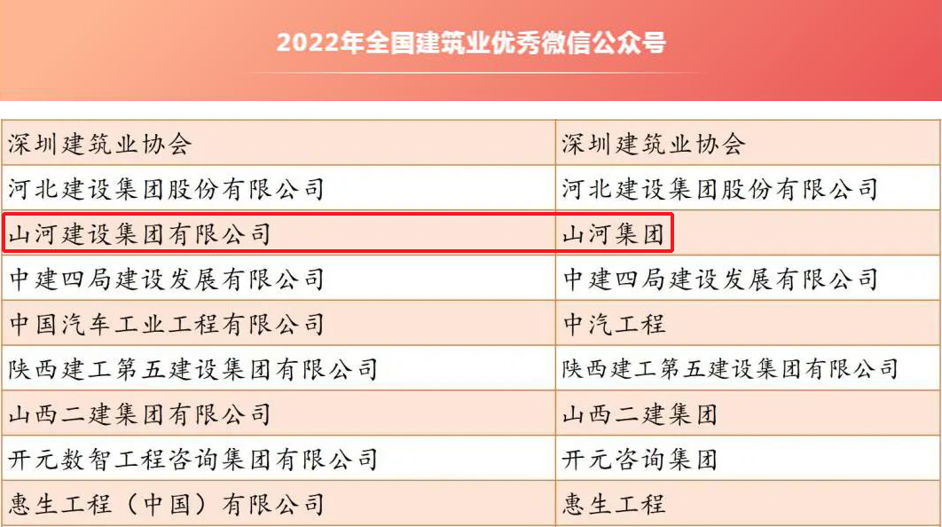 山河集團(tuán)公眾號獲評2022年全國建筑業(yè)優(yōu)秀微信公眾號