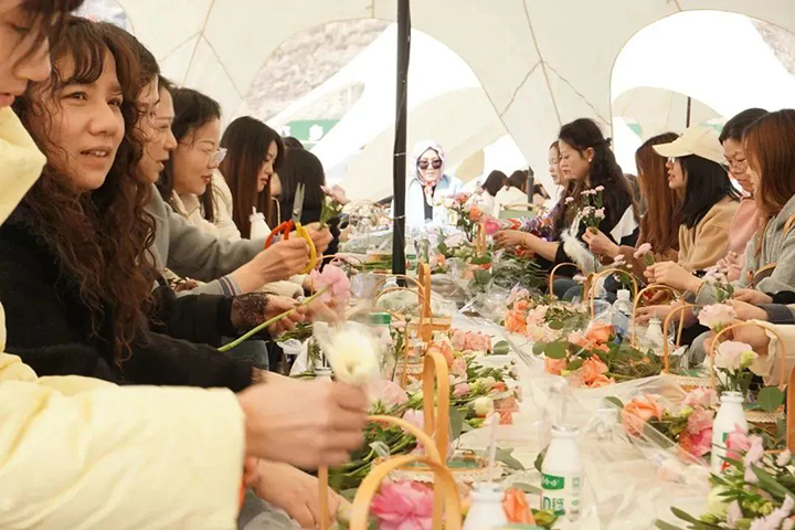 游覽結(jié)束后,大家來到月亮灣露營基地,進(jìn)行韓式手提花籃DIY活動(dòng)。在專業(yè)花藝?yán)蠋煹闹笇?dǎo)下,大家重新組合手中的小雛菊、康乃馨、玫瑰、洋桔梗等花材,充分發(fā)揮想象力和創(chuàng)造力,修剪枝葉、搭配色彩、設(shè)計(jì)造型,一株株鮮花變身成為絢麗的花籃。通過這次DIY活動(dòng),不僅令人減壓賦能、陶冶情操,而且在馥郁花香中感悟取舍之道,領(lǐng)會生活之美。